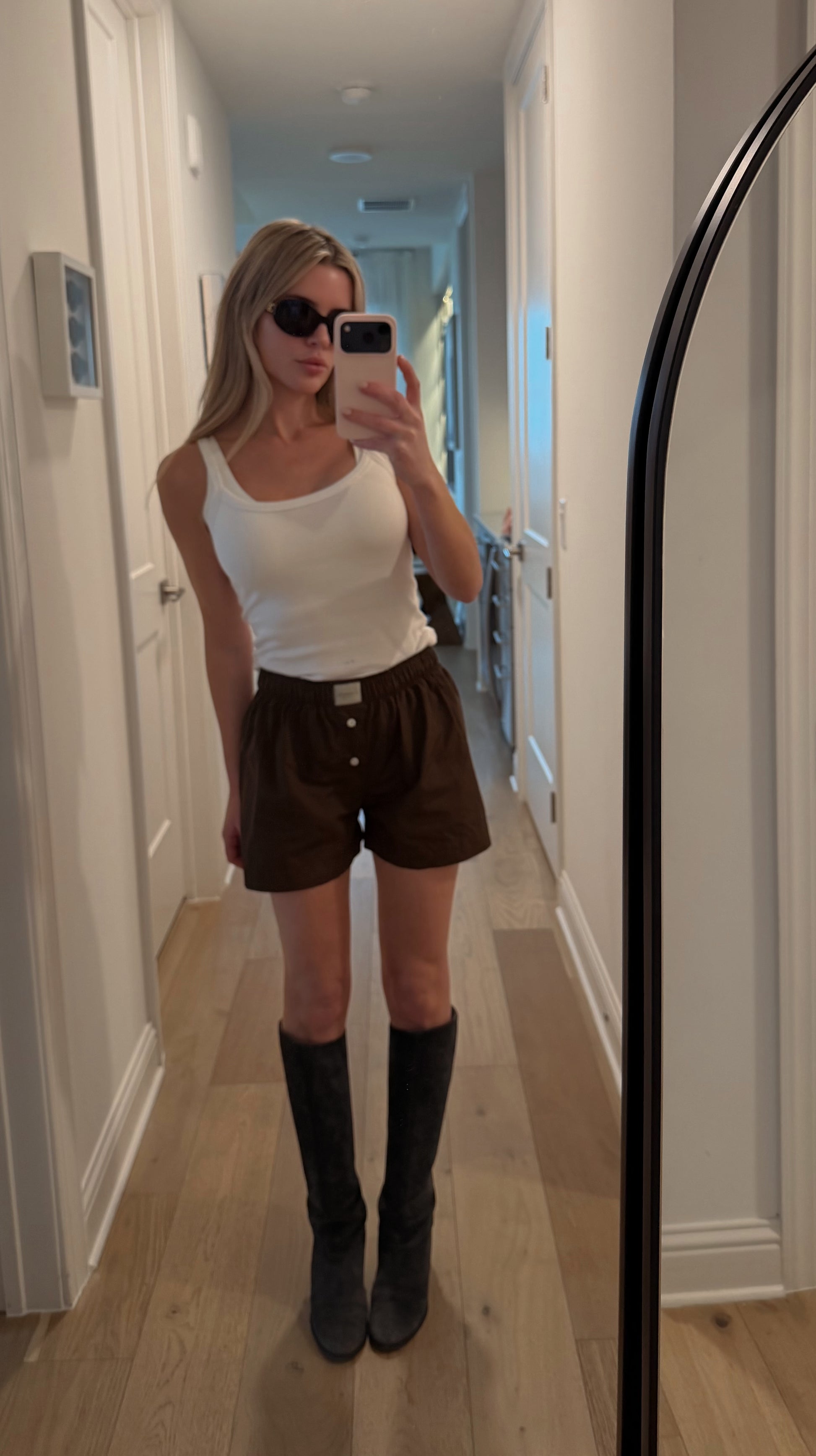 Lightweight cocoa shorts with a relaxed, boxer-inspired fit and an easy, effortless drape. High-waisted with a soft, broken-in feel that gives them that cool, off-duty look. Perfect with tanks, knits, or an oversized button-down when you want something casual but still elevated. The rich brown tone makes them surprisingly chic.