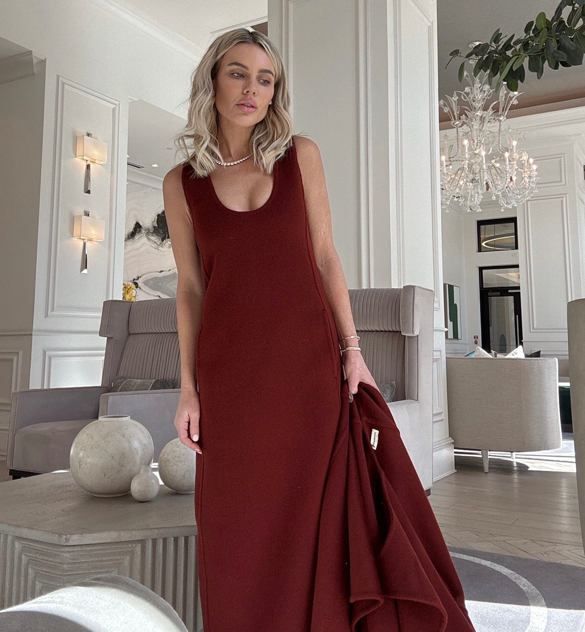 Two-piece winter set in deep wine: a fitted sleeveless dress with a matching cape-style knit. Elegant, cozy, and beautifully structured.
