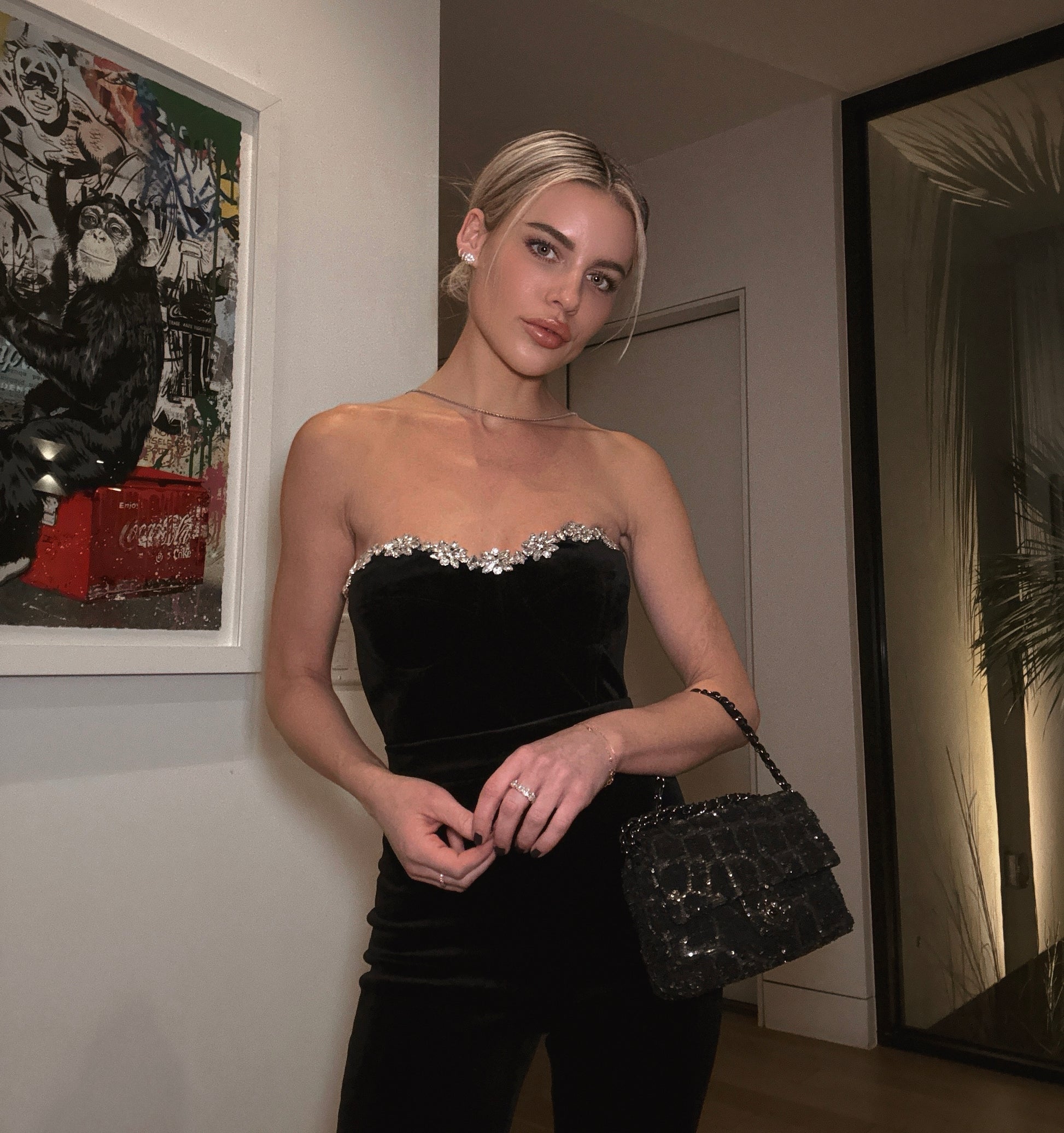 Black jewel-trim top + pant set with a sleek, sculpted fit. Bold, glam, and absolutely event-ready.