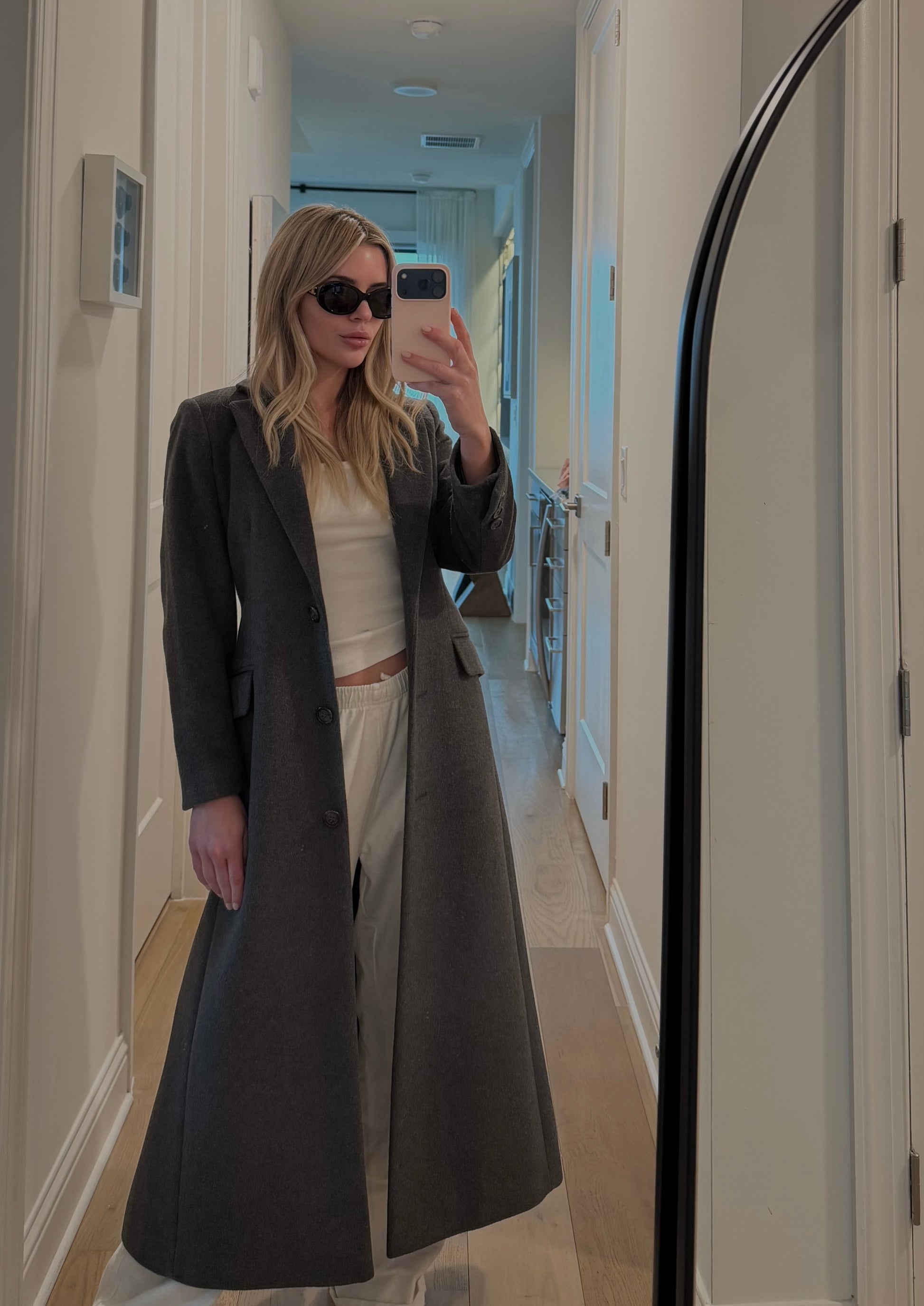 Tailored wool coat from Ralph Lauren with a long, elegant silhouette and clean, structured lines. The rich charcoal tone makes it an instant wardrobe staple, and the drape gives that polished, old-money energy without trying. Warm, refined, and versatile enough to layer over denim, trousers, or dresses. This is the coat that makes every winter outfit look intentional.