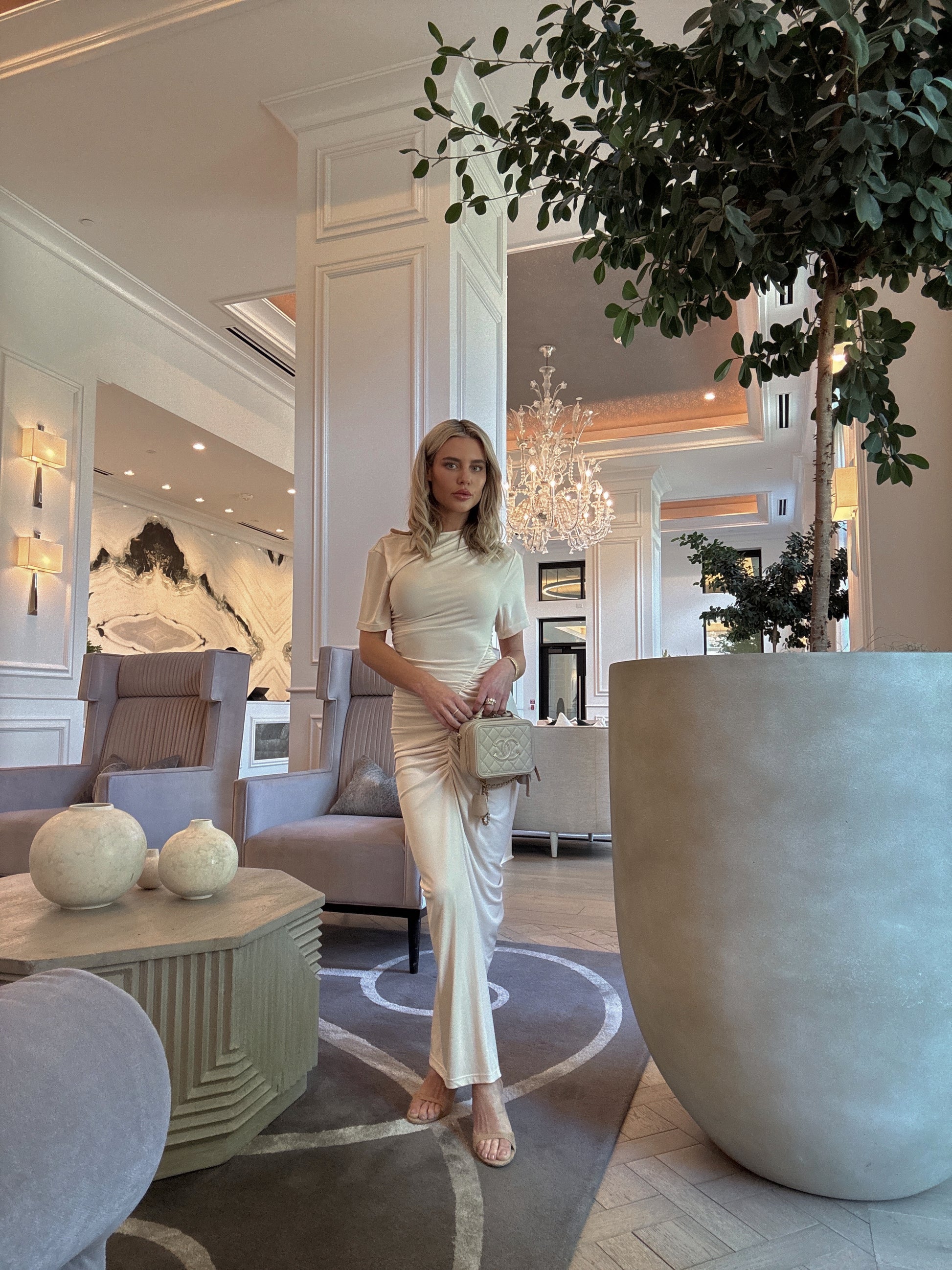 Cream ruched silhouette dress with a body-skimming fit and soft stretch. Elegant, minimal, and super flattering.
